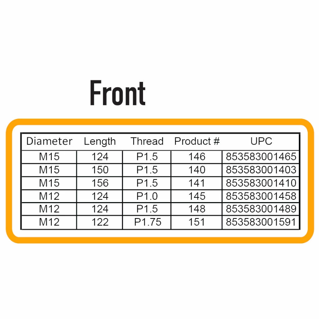 | Diamètre | Longueur | Filetage | 12 mm, 122 mm, 1.75 mm, 12 mm, 124 mm, 1.0 mm, 12 mm, 124 mm, 1.5 mm, 12 mm, 142 mm, 1.5 mm, 12 mm, 162 mm, 1.0 mm, 12 mm, 162 mm, 1.5 mm, 12 mm, 169 mm, 1.5 mm, 12 mm, 175 mm, 1.75 mm |