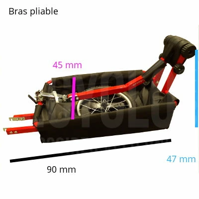 Le dépassement de la remorque derrière le vélo est de 1,20 m. Son poids est de 8.35 kg.