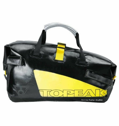 - Un grand sac impérméable aux coutures scellées, avec fermeture à zip puis par enroulement. Le sac DryBag Journey protège les affaires des intempéries et permet de les transporter facilement une fois à pied grâce à ses poignées (voir photo 3). Son volume est 65.3 litres. Son poids est de 1,6 kg. Il s’accroche à la remorque par des attaches velcro.